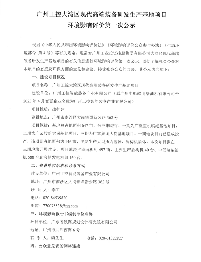 广州工控大湾区现代高端装备研发生产基地项目环境影响评价第一次公示