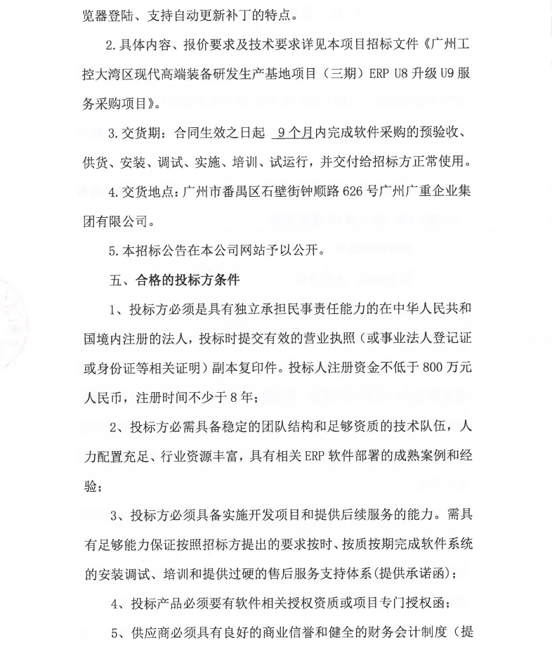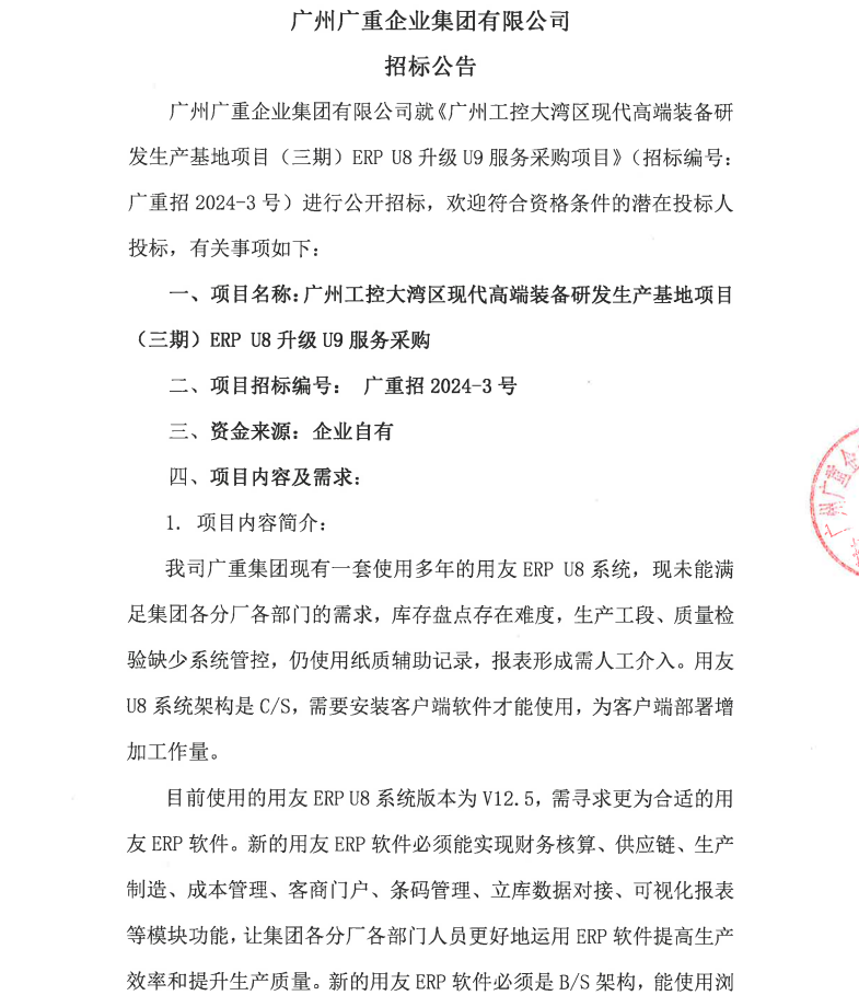 广州工控大湾区现代高端装备研发生产基地项目(三期)ERP U8升级U9服务采购项目招标公告