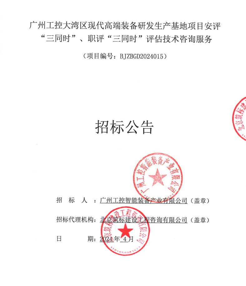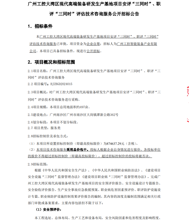 广州工控大湾区现代高端装备研发生产基地项目安评“三同时”、职评“三同时”评估技术咨询服务项目招标公告