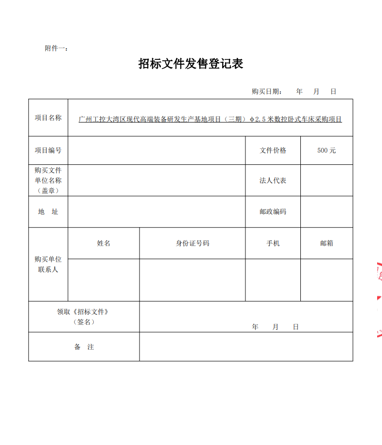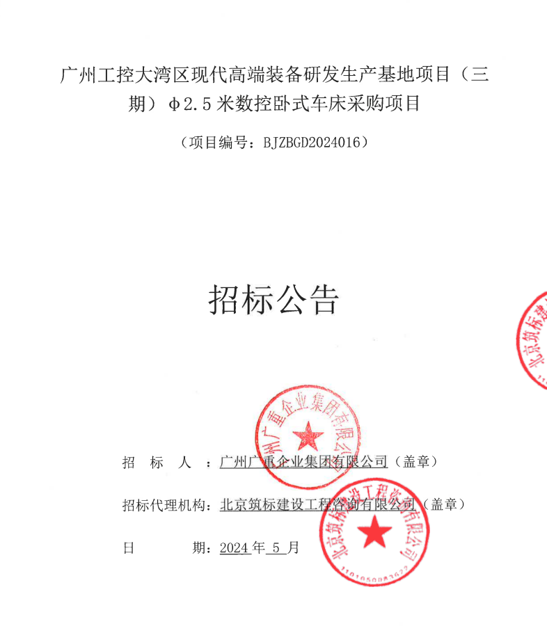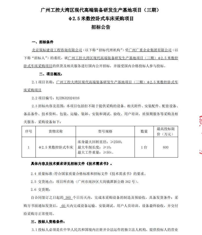广州工控大湾区现代高端装备研发生产基地项目 (三期)φ2.5米数控卧式车床采购项目招标公告