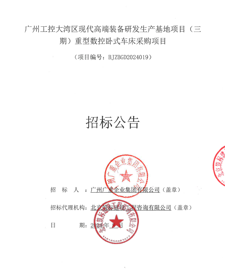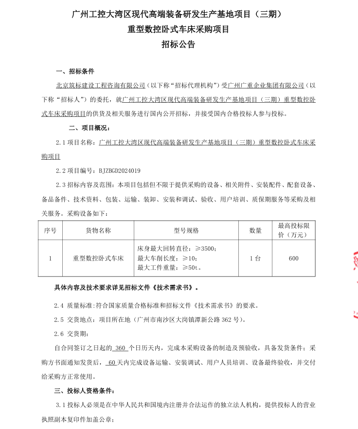 广州工控大湾区现代高端装备研发生产基地项目(三期)重型数控卧车采购项目招标公告