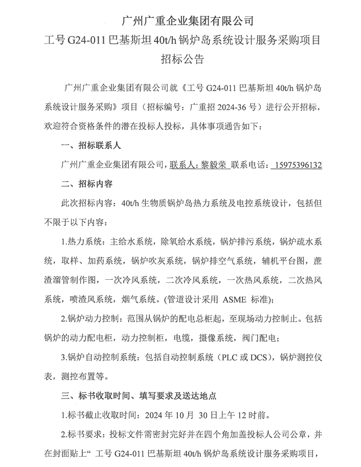 开云线上平台·(中国)官方网站集团工号G24-011巴基斯坦40t/h锅炉岛系统设计服务采购项目招标公告