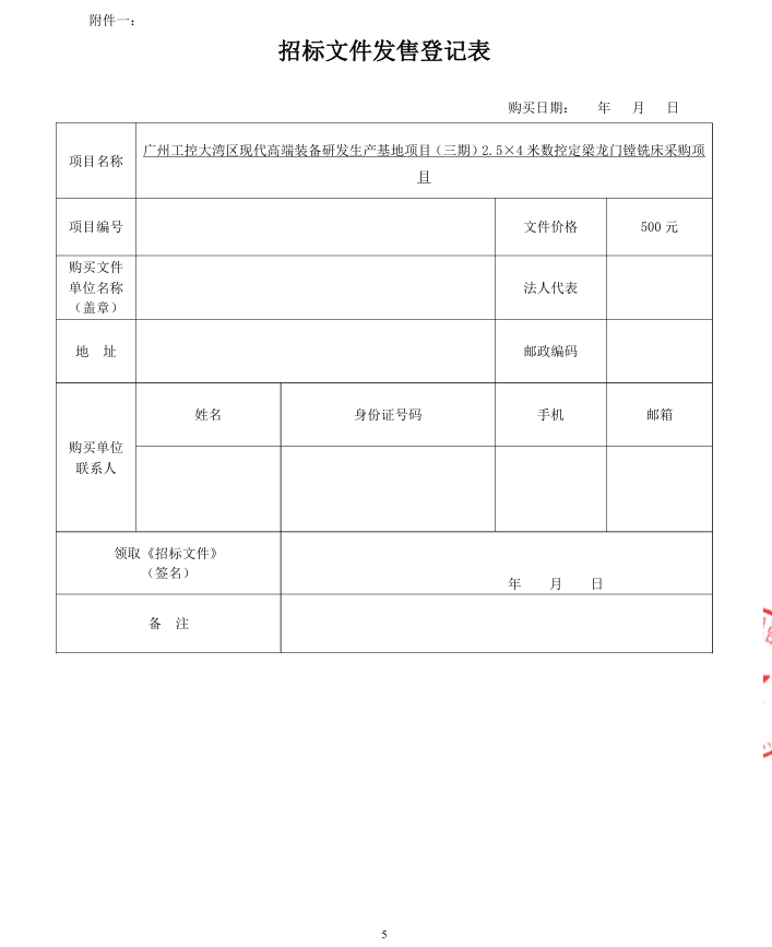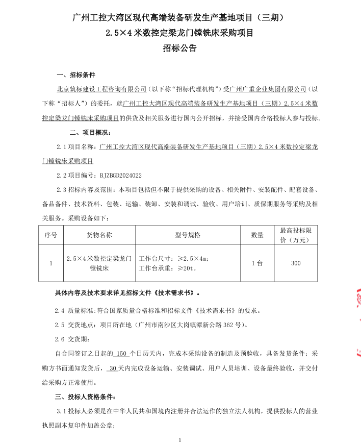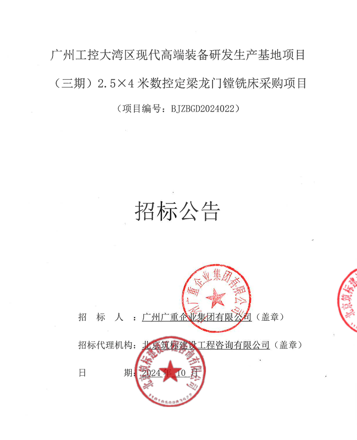 广州工控大湾区现代高端装备研发生产基地项目(三期)2.5×4米数控定梁龙门镗铣床采购项目招标公告