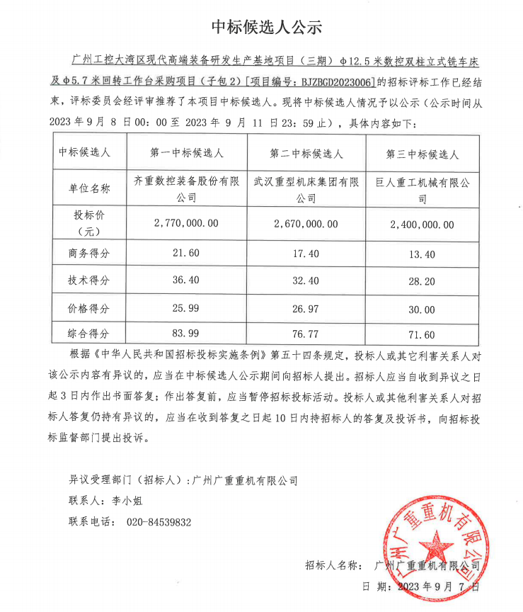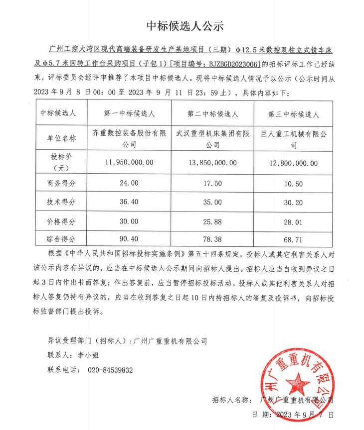 广州工控大湾区现代高端装备研发生产基地项目 (三期)φ12.5米数控双柱立式铣车床及φ5.7米回转工作台采购项目中标公告