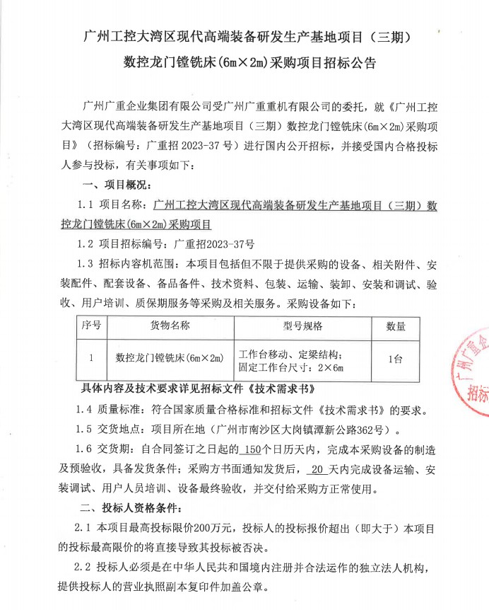 广州工控大湾区现代高端装备研发生产基地项目 (三期)数控龙门镗铣床(6mx2m)采购项目招标公告