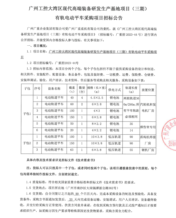 广州工控大湾区现代高端装备研发生产基地项目(三期)有轨电动平车采购项目招标公告
