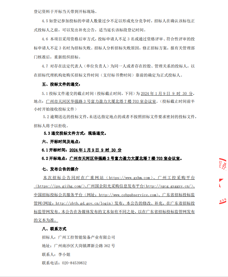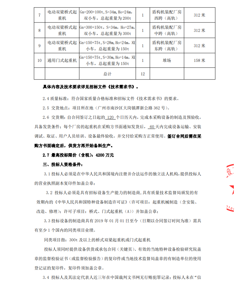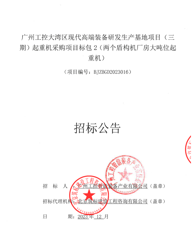 广州工控大湾区现代高端装备研发生产基地项目(三期)起重机采购项目标包2(两个盾构机厂房大吨位起重机)招标公告