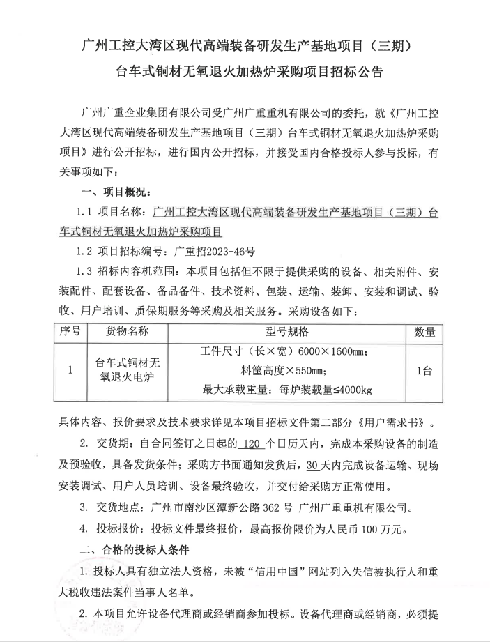 广州工控大湾区现代高端装备研发生产基地项目(三期) 台车式铜材无氧退火加热炉采购项目招标公告