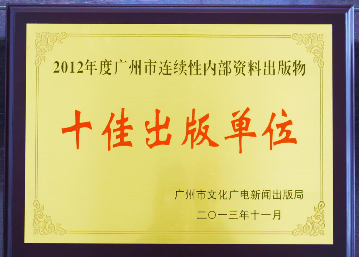 广州市文化广电新闻出版局于2013年11月27日上午在广州图书馆,召开2012年度广州市内部资料出版物“十佳”、“优秀”、“好新闻”表彰大会。我集团《今日开云线上平台·(中国)官方网站》荣获“十佳出版单位”称号,大会向获奖单位颁发了光荣册和奖牌(如图)。