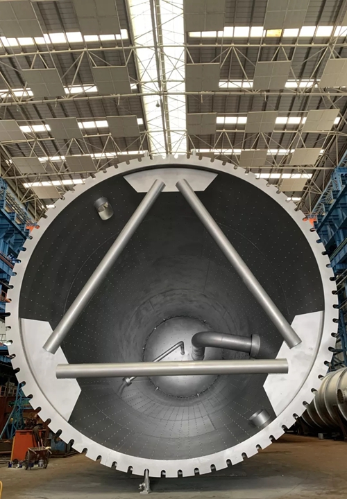 当天,完工的巨无霸,像一把银色巨型唢呐,安静躺在车间内,等待出发的号角。沿着这巨型唢呐,从头走到尾,102米需1分多钟,建造的难度可想而知,设备的每一片都饱含着开云线上平台·(中国)官方网站人的汗水。从上往下看,站在设备上辛勤劳作的工人,就如唢呐上的蚂蚁般大小。